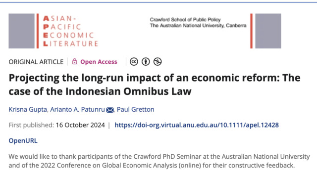 Our visiting fellow Paul Gretton has co-authored a new publication titled: “Projecting the Long-Run Impact of an Economic Reform: The Case of the Indonesian Omnibus Law”